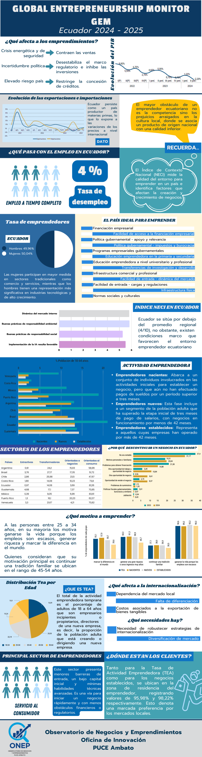 Ecuador destaca como uno de los países con mayor actividad emprendedora en la región, impulsado principalmente por jóvenes que ven en los negocios propios una alternativa frente a la falta de empleo y una vía para mejorar su calidad de vida. El informe también revela en qué sectores se concentra el emprendimiento, cuáles son los principales desafíos —como el acceso a financiamiento y la dependencia del mercado local— y qué factores del entorno influyen en el crecimiento de las empresas.